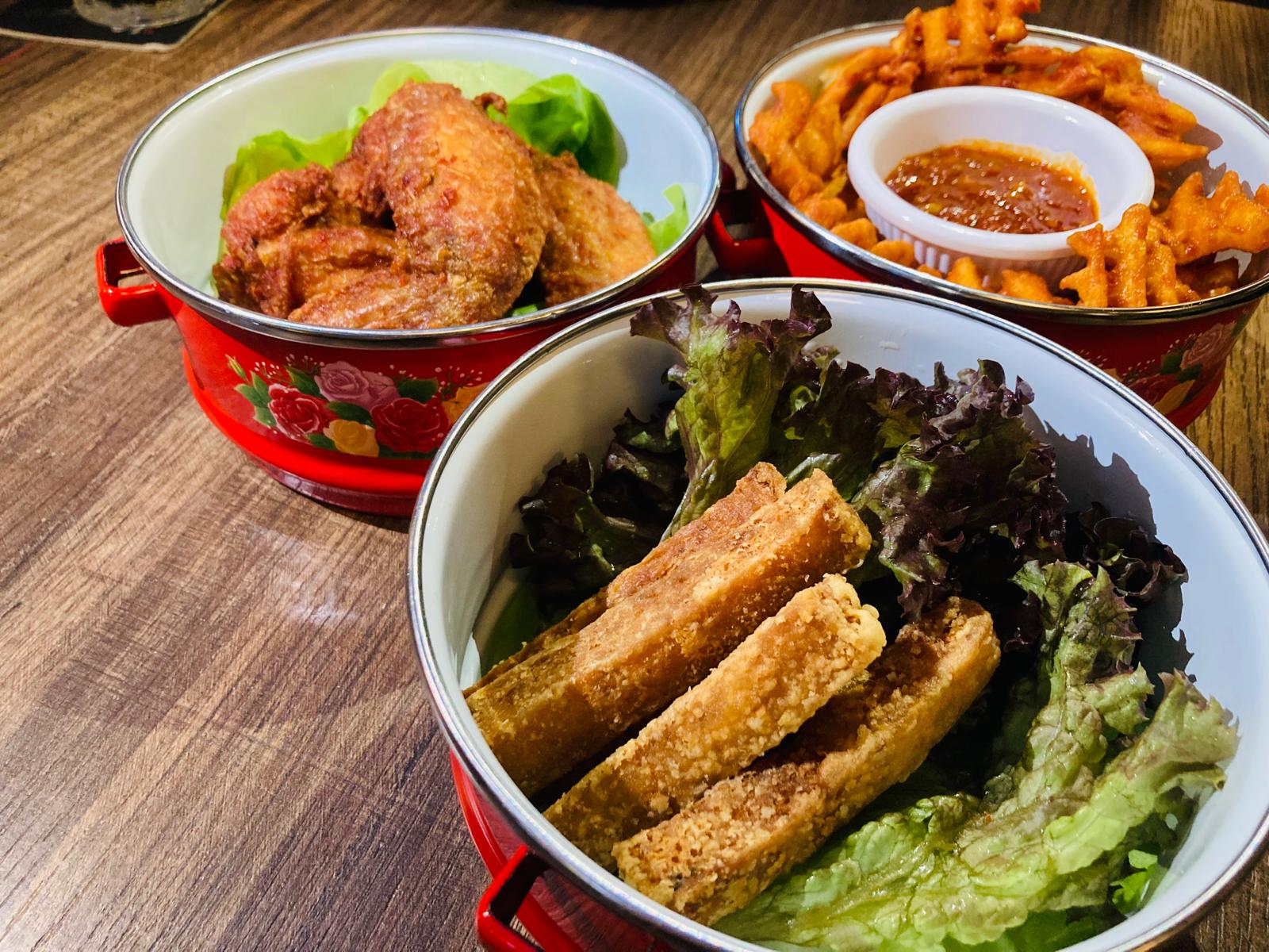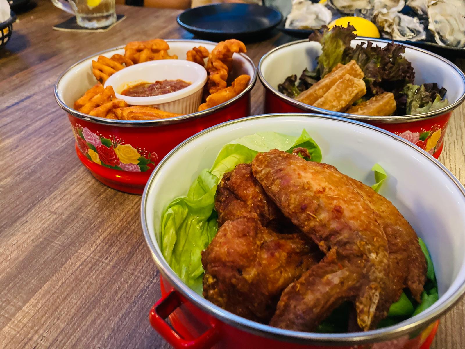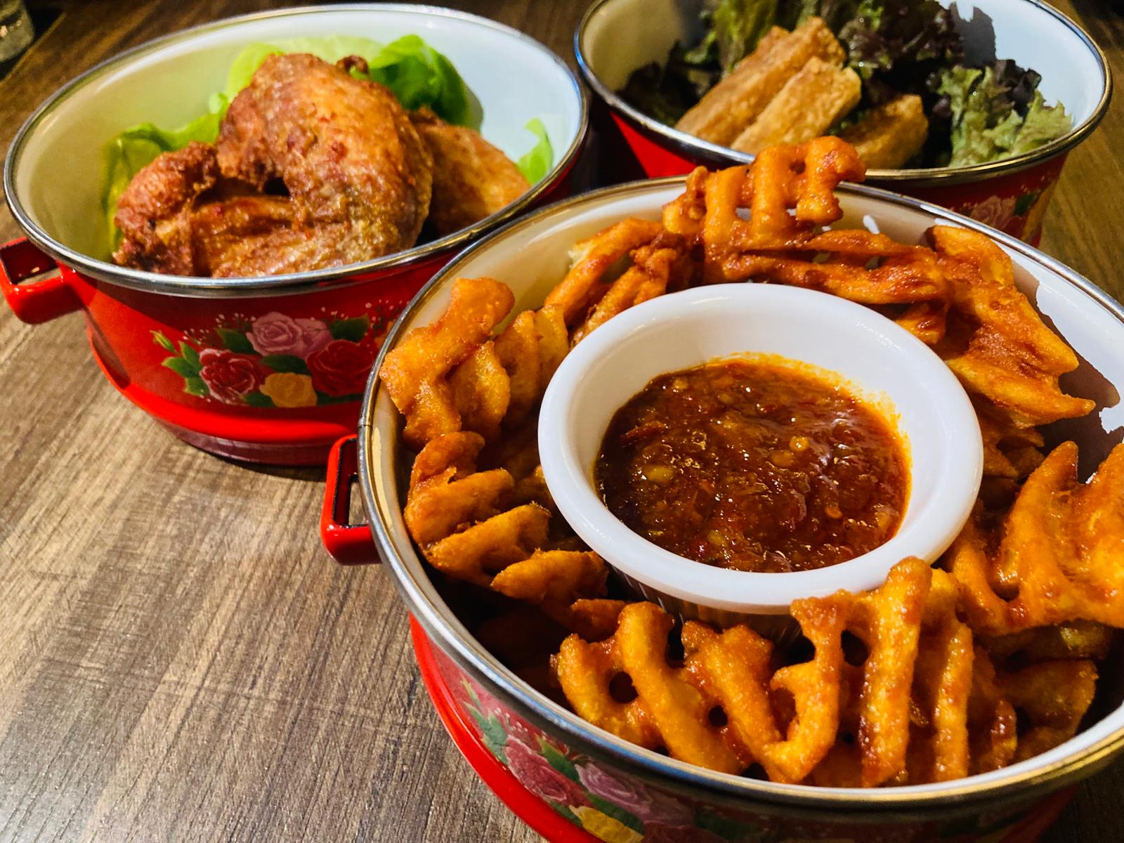 Local favourites tingkat includes: Chilli Crab Fries, Chefs Special Otah Tofu and Five Bar Signature Wings.