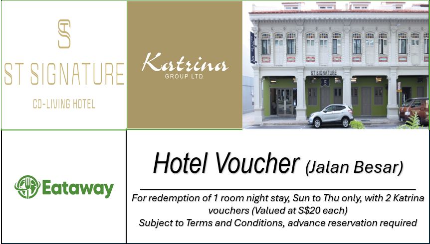 Hotel room bundle voucher: 1x room night in ST Signature Jalan Besar (Sundays to Thursdays) and 2x Katrina S$20 value Katrina Voucher, stays in December 2025