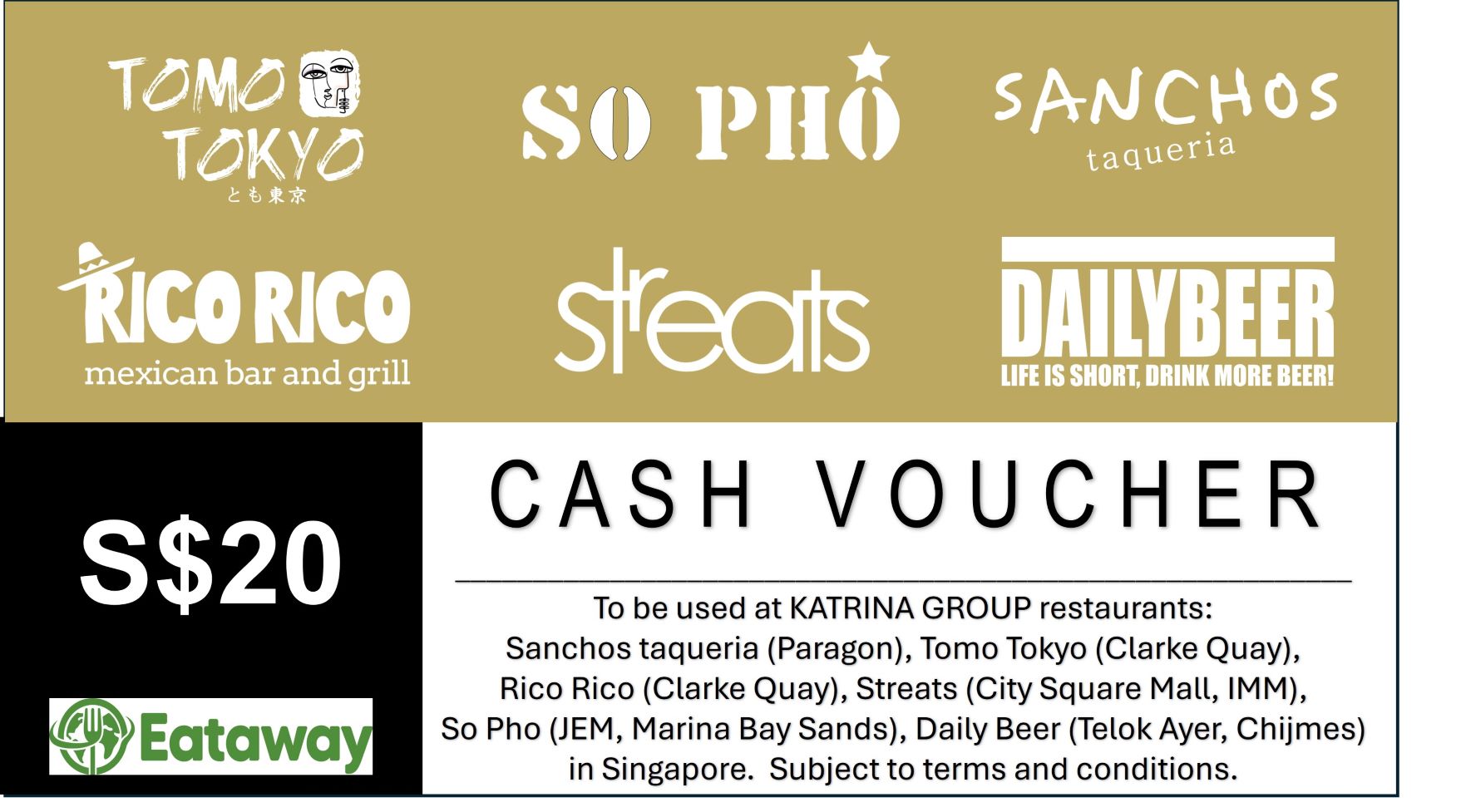 • E-vouchers are valid for dine-in only and must be used within the stipulated period at Katrina brands selected outlets in Singapore: Sanchos taqueria (Paragon), Tomo Tokyo (Clarke Quay), Rico Rico (Clarke Quay), So Pho (JEM, Marina Bay Sands), Streats (City Square Mall, IMM), Daily Beer (Telok Ayer, Chijmes)